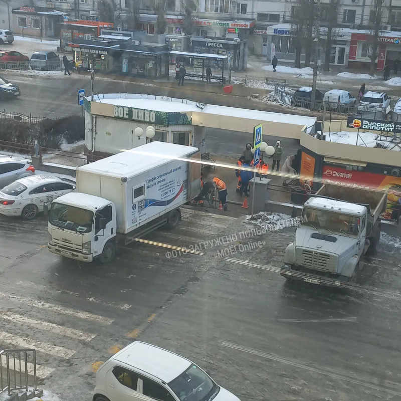 Прям на входе в Аксиому на Лизюкова, ковыряют плитку в поисках проблемы.. рабочие Водоканала шутят что как бы не пришлось вскрывать все до до входа в Аксиому