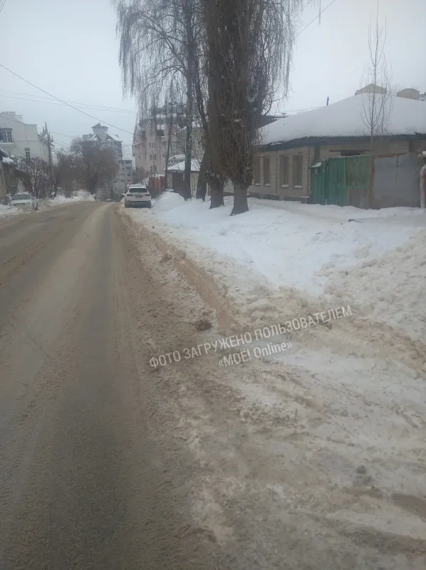 Прошло больше недели после снегопада, но улица Пятницкого всё ещё плохо расчищена. Это центральная городская магистраль с высоким транспортным потоком, состоящая из двух полос и небольшого пространства для парковки.