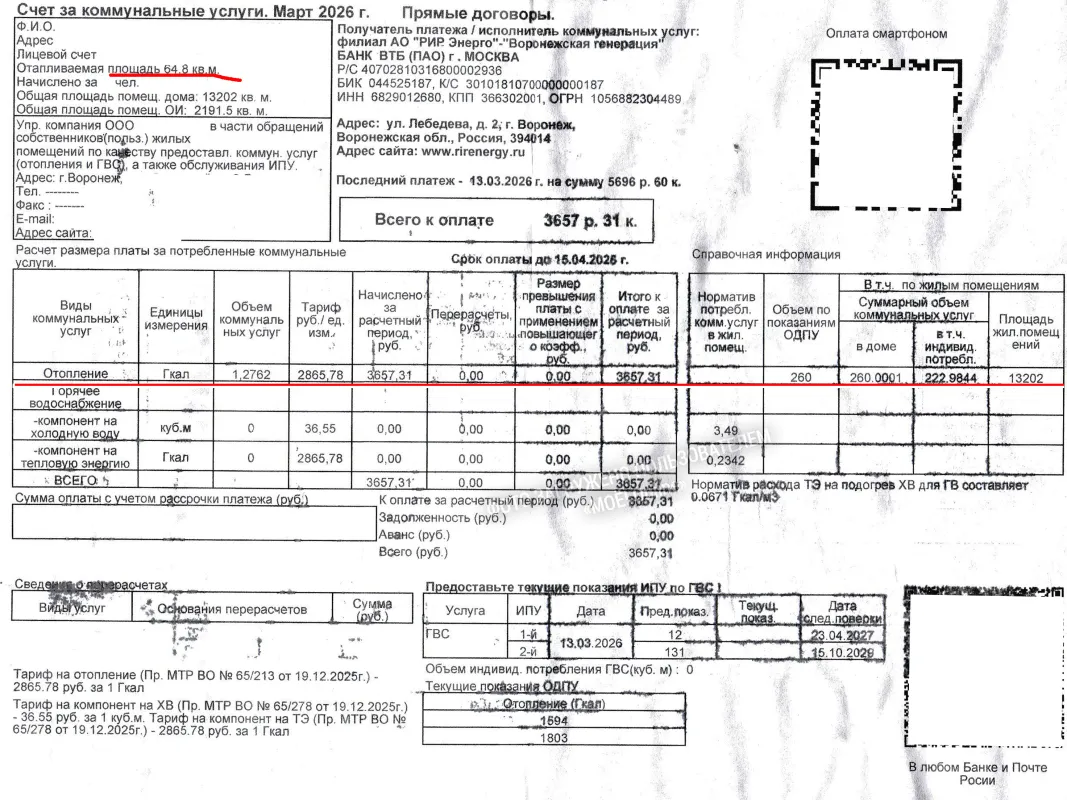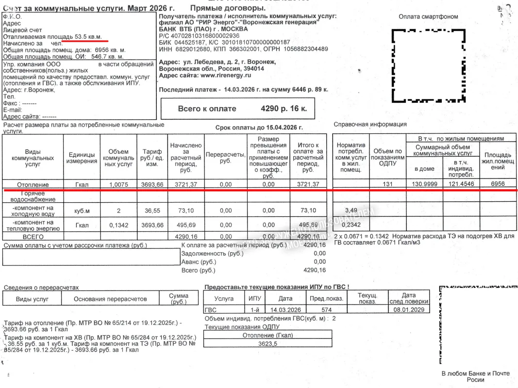 Наконец пришла последняя бумажная квитанция (платёжный документ) за отопление за март.